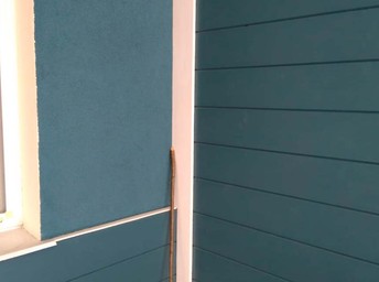 Описание: Первый этаж из дерева покрашен укрывной краской Zobel protect 5450 в цвете Ral 5020. На второй этаж нанесена декоративная штукатурка Ceresit CT60, заколерованная в такой же цвет.