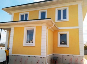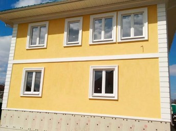 Описание: Утеплен каменной ватой Технониколь Технофас 100мм, плотность 150 г/м3. Приклеивание утепоителя и армировка с фасадной сеткой производилась клеевой штукатурной смесью Ceresit CT 190. Сетки и угловые профили фирмы Caparol. Финишная отделка произведена декоративной штукатуркой Ceresit CT 174 фракция 2мм цвет Gobi 4. Декоративные элементы и обрамления окон цвет White.