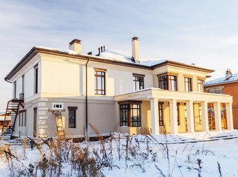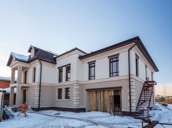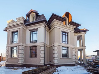 Описание: Силикатно-силиконовая декоративная штукатурка Короед Ceresit CT 175, второй этаж и декор на углах цвет Colorado 4 1/10. Первый этаж и эркер цвет Colorado 4.
