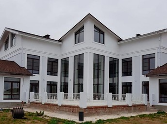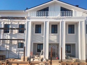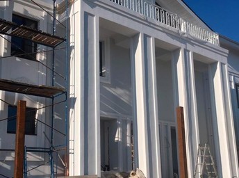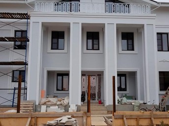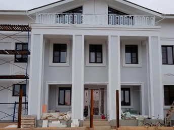 Описание: Сложный фасад под покраску, утеплялся фасадным пенополистиролом с созданием армирующего слоя с сеткой, после чего была нанесена финишная фасадная шпатлевка Ceresit CT225. Покрашен фасад эластичной трещиностойкой краской Isomat Flexicoat цвет CW30 и белый. Преимуществом данной краски, является способность растягиваться до 3мм и скрывать возможные микротрещины.